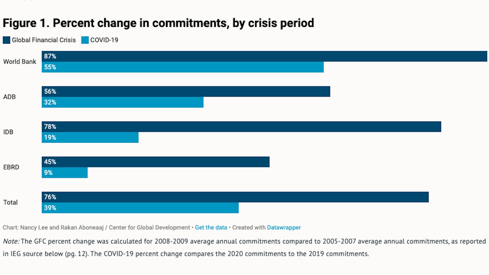 The data suggest a smaller overall response to the COVID-19 crisis than the GFC despite the larger economic toll taken by the pandemic in most developing regions, uneven performance across institutions, and a weak outcome for private sector finance.
