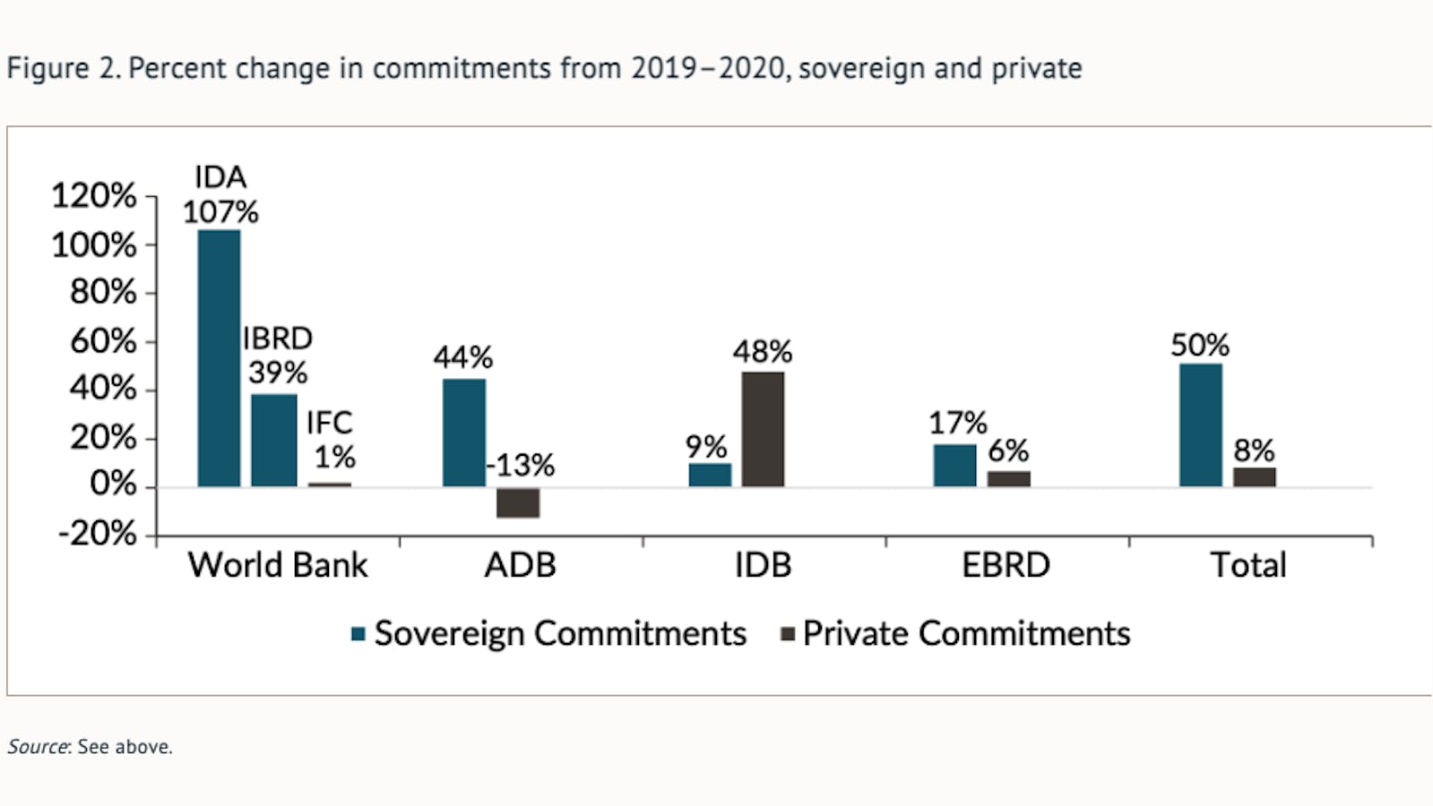 And the MDBs clearly struggled with their countercyclical role in private finance. Total finance to the private sector rose by only 8 percent. Surprisingly, IFC (the World Bank Group’s private finance arm) commitments were essentially flat, and AsDB commitments to the private sector fell (perhaps to make room for more sovereign lending since both public and private lending are on the same balance sheet for the AsDB). Only IDB Invest, the private finance arm of the IDB Group, excelled with 48 percent growth in commitments.