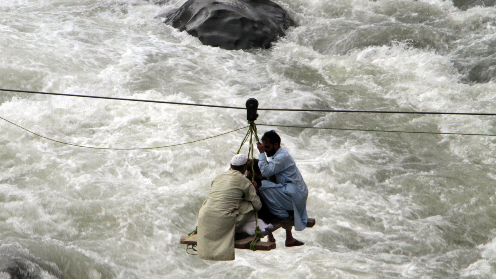 People cross a river on a suspended cradle in Bahrain, Pakistan, Aug. 30, 2022. The UN and Pakistan issued an appeal for $160M in emergency funding to help millions affected by floods that have killed more than 1,150 people since mid-June. Image: Naveed Ali/AP